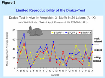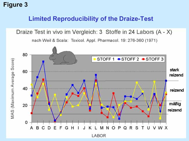 A fundamentally well-known problem of the Draize-test at the rabbit eye is moreover the limited reproducibility which was already proven in a comprehensive validation study by Weil and Scala in 1971 and the result of which is shown in Figure 3.