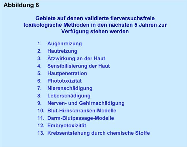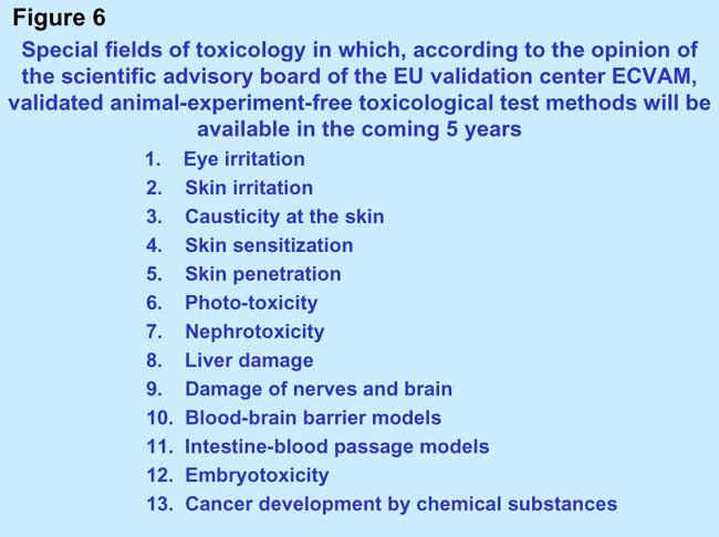 The scientific advisory board of the EU validation center ECVAM assessed in 2001, in connection with the proposal of the EU Commission for a new chemicals policy that in approximately five years there will be animal experiment-free-alternative methods for toxicological test methods available. The assessment summarized in Figure 6 clarifies that for the most important fields in toxicology there will be animal-experiment-free methods available (EU Commission 2001) very soon.