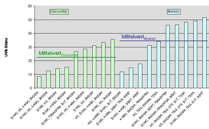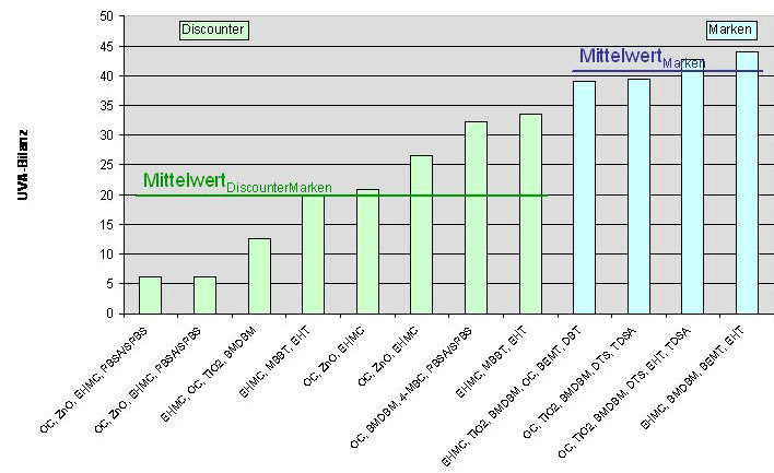 Conclusion On the basis of the substantiated findings about the consequences of UV radiation, experts claim unanimously sun protection products comprehensively shielding both in the UVB and UVA area (11, 12). Products available in the market come up to these requirements only to some extent. Test results show a distinctive differentiation in the UVA protection performance of the products tested. Exclusively products of research-active producers fulfil the demand relating to a consistent UVB and UVA protection which is to exceed significantly the minimal requirements of the Australian standard for products with high SPF in the UVA area. In contrast, discount products show clear deficits in this protection aspect although this cannot be concluded from the declaration usual at the present time. In particular, the discount products exhibit deficits in the UVA balance values for children products. The latter seems to be particularly fatal in consideration of the fact that parents have the intention to optimally protect their children. This is why the pressing