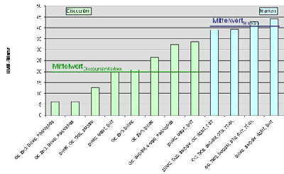 Result and discussion Also for the analysis of products with higher light protection factor the new DIN method for the determination of the UVA protection performance can be applied without limitation and without experiencing difficulties. The individual results can be found in table 1 and table 2. The UVA balance values established vary in the sector of 6.1 to 51.7. This means that differences are even more pronounced for products with higher SPF than for products with SPF 10 to 12 which were tested in the preceding years (6, 7). This large range was nevertheless predictable: for products with higher protection a marked difference is nearly unavoidable depending on whether a product comes just up to the Australian standard or shows an optimally balanced UVA and UVB protection. Owing to the experience of the previous years, the UVA balance values have been considered differentiated according to the origin of the products, i. e. whether they are from researching producers or from discount stores. In the group of standard products sun creams, lotions and sprays by researching producers performed on average better by 54 percent compared to products from discount stores (illustration 3). The optimal UVA balance
