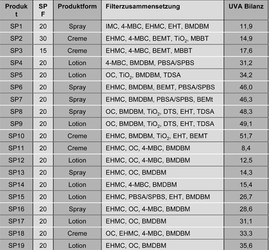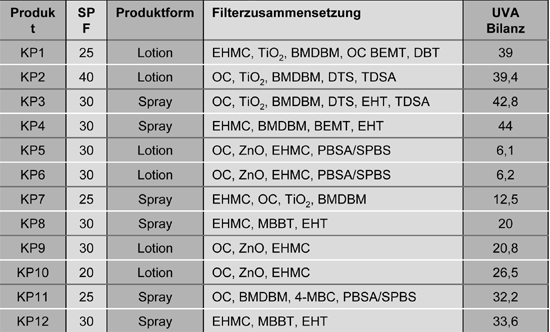 performance at the same time from long-term light related damage. In total 31 sun protection products had been purchased in chemist's shops, in grocer's shops and pharmacies for the tests. Subject to testing were body lotions, facial creams and sprays with varying UV filter systems and SPF values between 15 and 40; thereunder 19 standard and 12 sun protection for children. On most products the UVA-/UVB wideband protection according to the Australian standard AS 2604 was indicated. Only in rare cases the feature of a particularly well-balanced or equilibrated relationship of UVA and UVB protection - without reference to the Australian standard - has been claimed. Detailed information regarding the SPF, product category as well as filter properties are to be found in table 1 and table 2.