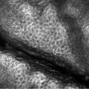 Mit der konfokalen Laserscanmikroskopie stehe eine nicht invasive In-vivo-Technologie zur Verfügung, die horizontale Schnitte der Haut mit guter zellulärer und subzellulärer Auflösung zeige (Abbildung). Das Verfahren biete die Möglichkeit, Epidermis und Dermis schichtweise von der Hornschicht bis zur oberen Dermis zu erfassen und bis zu einer Eindringtiefe von etwa 300 Mikrometer zelluläre Unregelmäßigkeiten zu evaluieren.