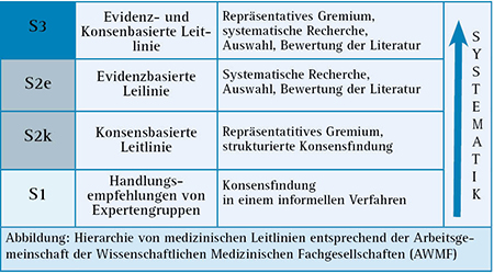 Von der AWMF wird eine Hierarchie von medizinischen Leitlinien vorgegeben (siehe Abbildung). Danach werden Handlungsempfehlungen von Expertengruppen (S1-Leitlinien), konsensbasierte Leitlinien (S2k-Leitlinien), evidenzbasierte Leitlinien (S2e-Leitlinien) sowie evidenz- und konsensbasierte Leitlinien (S3-Leitlinien) unterschieden.